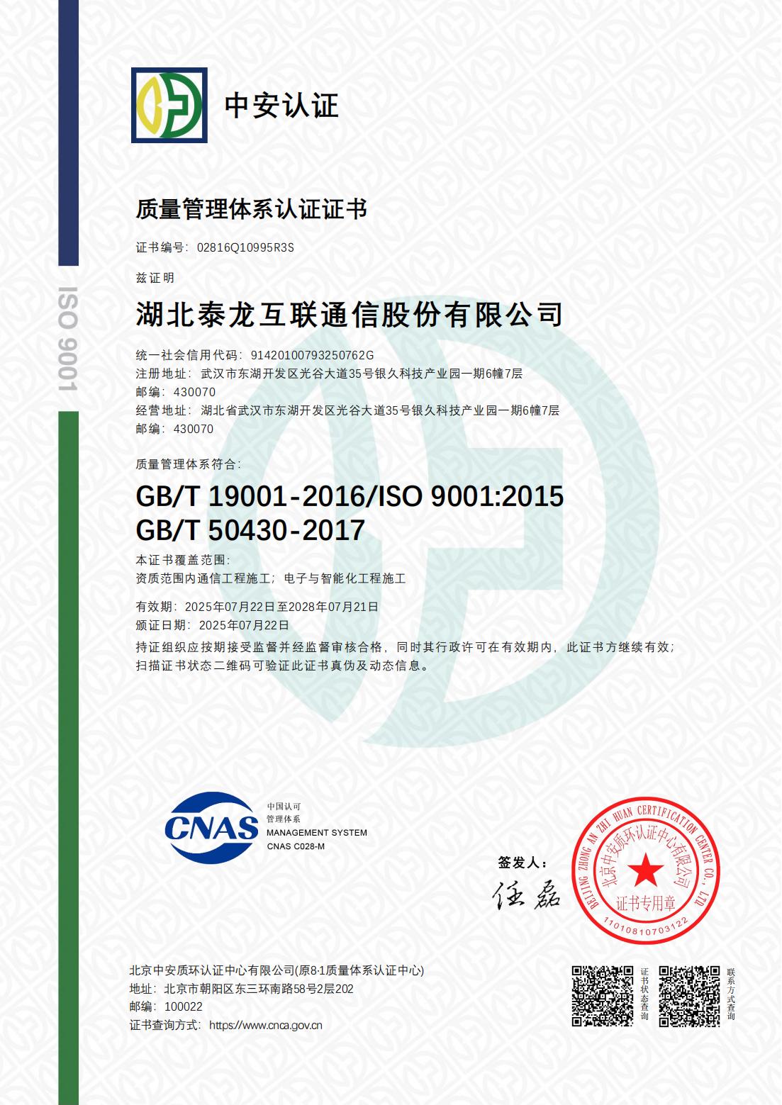 2025年7月22日,泰龙互联公司正式通过了质量、环境和职业健康安全管理体系认证并取得了国家标准认证证书。这标志着公司整体管理水平又上了新的台阶,对提升企业形象,提高企业竞争力,促进公司更好更快地发展,有着深远而重要的作用和意义。