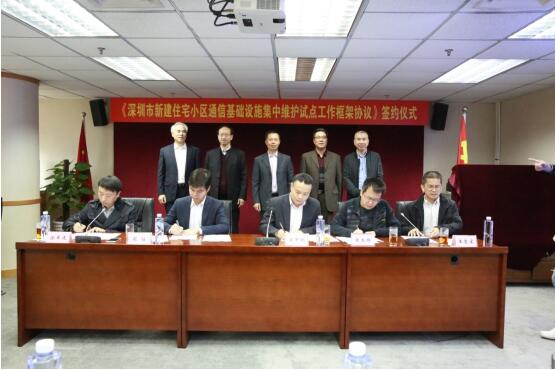 为贯彻落实网络强国战略,在全国率先建成网络强市,解决“最后一公里”网络维护管理空间问题,在深圳市通信管理局、深圳市通信建设管理办公室的统一指挥和部署下,在各基础电信运营商的大力支持下,2017年12月28日,湖北泰龙互联通信股份有限公司、深圳市电信工程有限公司与深圳电信、深圳移动、深圳联通三家基础电信运营商共同签署了《深圳市新建住宅小区通信基础设施集中维护试点工作合作框架协议》,签约仪式在深圳市通信管理局隆重举行。签约仪式由深圳市通信管理局何承健副局长主持,深圳市通信管理局许俊峰局长出席签约仪式并发表重要讲话。此次多方合作框架协议的签署标志着深圳市新建住宅小区通信基础设施第三方集中维护试点工作全面启动,也标志着全新升级的“泰龙模式”得到了特区行业主管部门的认可和推崇。